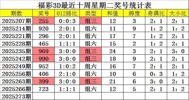 奖号类型分析:从近期周二开奖数据分析,组六号码最近十周出现6次,表现较冷,上周二开出组六,组三开出4次,表现相对较热,本周二预计组六号码回补。
