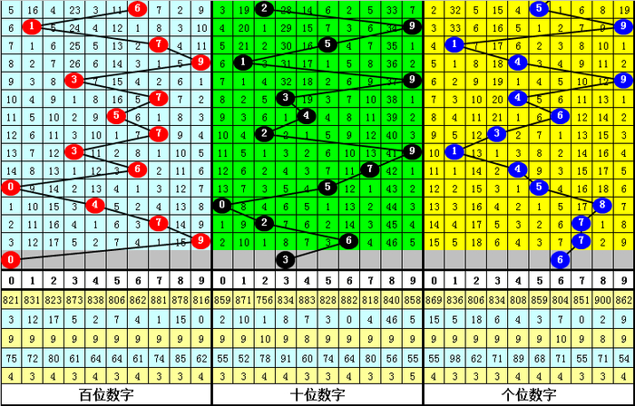 跨度分析:最近周二跨度出现范围在2-9区间,跨度比较集中,上周二跨度为5,跨度下降1个点位,本期看好跨度上升,参考跨度6。
