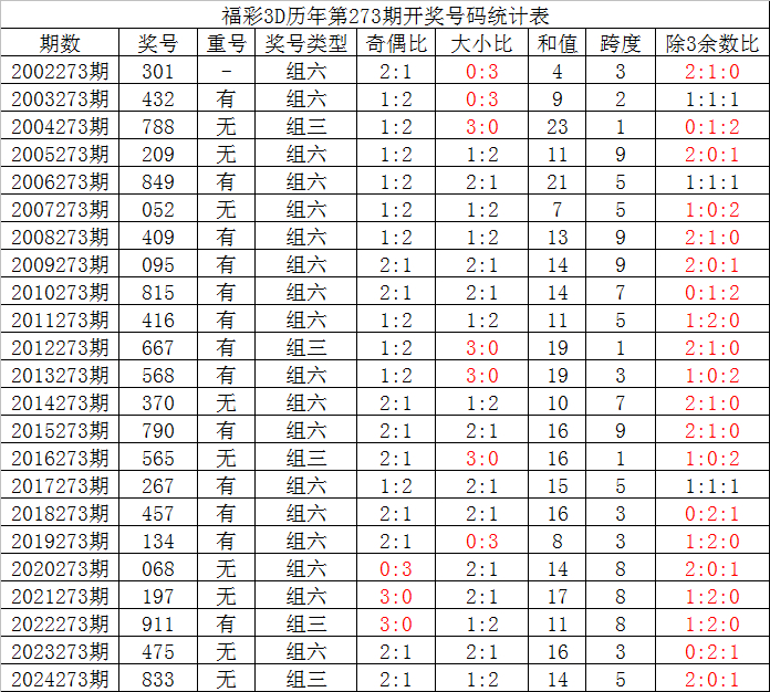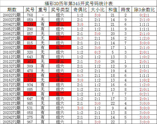其中,组三号码开出5次,组六号码出现18次,组六号码目前连续1年没有出现,本期今年同期看好开出组六号码。